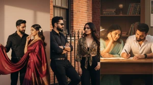 "Create an image of a young couple seated at a wooden desk under a warm light from a desk lamp. The girl is wearing a soft, light blue saree, resting her head on one hand, and gazing attentively at the boy who is writing on a piece of paper with a pen. The boy is dressed in a white shirt and is focused on writing. The background features bookshelves with a calendar on the wall showing the year 1995. The lighting should be soft, and the mood should feel intimate and calm."