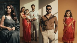 "Create a vintage, retro-style family photo featuring a couple and their child. The man is dressed in a classic black suit, white shirt, and watch, holding the child in his arms. The woman is wearing a traditional black saree with gold detailing, with long dark hair flowing down her back. The lighting should be soft and warm, with the shadows creating a cozy ambiance. The background should have muted, warm tones with dramatic shadows cast from a window. The couple should be looking at each other with soft, affectionate smiles. Keep the faces exactly the same as the uploaded photos for originality. The child should look curious, wearing a simple black shirt. The photo should evoke a timeless, romantic, and nostalgic feel."