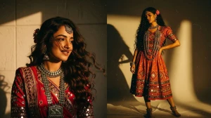 4K Hd Retro Vintage Photograph Of The Same Girl (Keep Face Exactly Same, No Changes), Wearing A Traditional Bright Garba Dress With Mirror Work And Heavy Silver Jewellery, Styled In A Pinteresty Aesthetic. She Has Long Dark Brown Wavy Curly Hair With A Small Flower Tucked Into Her Curls, Blowing Slightly In A Romantic Windy Atmosphere. The Lighting Is Golden Hour With Warm Tones, Deep Shadows Against A Minimalist Textured Wall. The Vibe Feels Like A 90S Bollywood Movie Still, Grainy Film Effect, Mysterious And Artistic Mood. Her Expression Is Moody Yet Calm, Happy And Introspective.