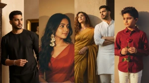 "Ultra realistic, 8K resolution cinematic portrait of a person indoors. He is leaning against a beige wall next to an antique dark wooden cabinet with intricate floral carvings, mirror panels, and decorative knobs. He wears a well-fitted, deep black textured kurta with rolled-up sleeves, accessorized with a silver bracelet on his wrist and His hair is styled neatly, Face with the face from the uploaded image, keeping the facial features, exactly the same. giving him a confident and thoughtful expression as he gazes slightly away from the camera. Soft warm lighting creates realistic shadows on his face and surroundings, enhancing the contours and fabric details. In the background, a framed classical painting adds elegance to the vintage setting. The reflection in the mirrors is soft and adds depth. The overall scene feels sophisticated, calm, and intimate, with sharp details, realistic textures, and natural colors that highlight the ambiance of the room."