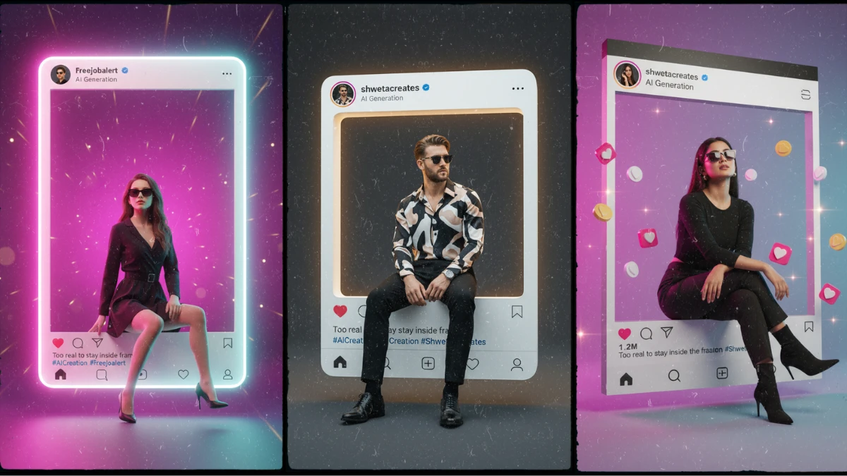 A hyper-realistic portrait of the uploaded stylish young woman inside a giant Instagram post frame. She wears her black dress, sunglasses, and sleek shoes, radiating bold confidence. Her pose is casual yet powerful, with one leg stepping outward from the Instagram frame in a surreal 3D effect. The Instagram frame fills most of the composition with username freejobalert, verified checkmark, display name "Al Generation", caption: "Too real to stay inside frame. #AlCreation #freejobalert", and realistic icons and dp should be the same uploaded image model. The background bursts with viral energy. a radiant hot pink and electric purple gradient, softly glowing behind the frame. Subtle sparkles and faint bokeh circles float in the background, adding movement and viral appeal without overpowering her. Balanced cinematic light makes her outfit and the 3D frame illusion the focus.
