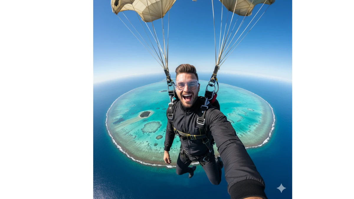 Ultra-realistic wide-angle selfie of a man (sent photo, face 100% preserved, 4K quality) during a skydiving jump over the Great Barrier Reef in Australia. He is wearing a black jumpsuit with a well-fitted parachute harness and transparent protective goggles. His hair is identical to the one in the image, and the person has an expression of joy and excitement. The straps and lines of the parachute are visible above him. Below, the turquoise ocean reveals vibrant coral reefs, colorful marine patterns, and small tropical islands.