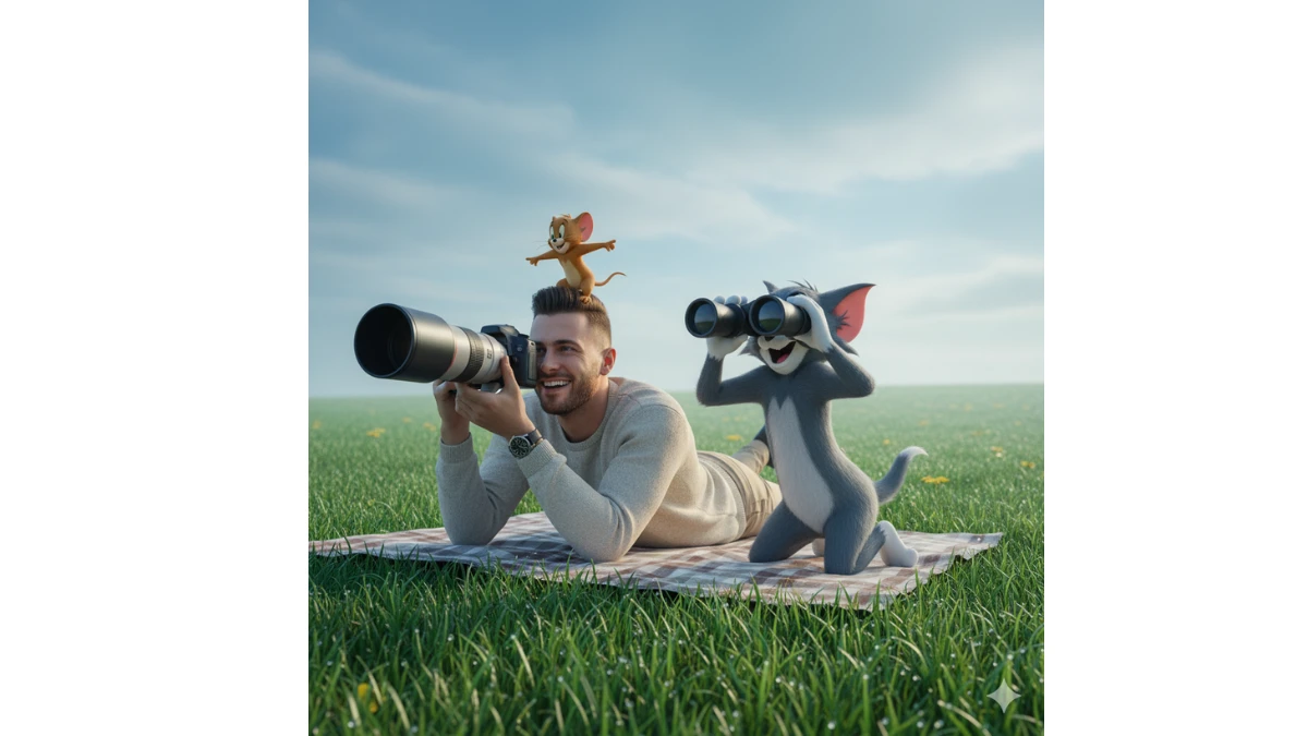 A hyper-realistic and imaginative scene set in a lush green field at marning, with a cool glow illuminating the sky and soft clouds. In the foreground, this man in the above image lies on the grass, smiling as he looks through a professional DSLR camera with a large telephoto lens. Beside her, the iconic cartoon character Tom (the gray cat from Tom and Jerry) kneels with excitement, holding binoculars and peering into the distance. On top of the mans head stands Jerry (the small brown mouse), pointing playfully forward with a mischievous expression as if guiding the adventure. The composition blends realism and fantasy seamlessly, with vibrant details in the grass, natural lighting, and the expressive cartoon characters integrated into the real world. The atmosphere is joyful, adventurous, and cinematic, evoking a sense of playful exploration and friendship.