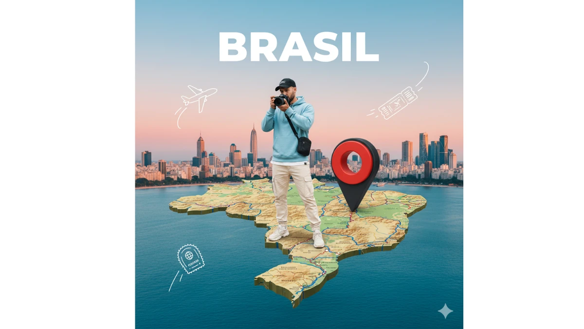 Ultra realistic editorial photorealistic travel concept (as photo reference) slay on a giant realistic travel map of [BRASIL] floating in the air above the sea. On the map there is a large 3D location pin marking the destination. Behind him is the iconic realistic skyline of [BRASIL] with its signature landmarks, and the word 'BRASIL' written in bold clean travel typography floating in the sky He wears streetwear (cream cargo pants, light blue hoodie, chunky sneakers, crossbody bag, cap and Nikon camera Z6 III), a universal look that works for every destination. Playful elements: floating doodles of airplane, airplane ticket, passport stamp. Bright cinematic lighting with pastel sky gradient. AR 3:4