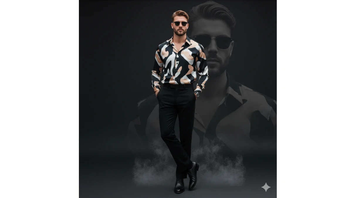 A stylish young man wearing a same in a photo, standing confidently with hands in pockets, one leg crossed over the other, wearing black formal shoes, studio portrait with soft lighting, elegant dark background, cinematic look, professional photo editing, a large faded background portrait of the same person in black sunglasses, premium magazine photoshoot vibe. Same face as the uploaded image And add Fine smoke on the floor a metallic text in background