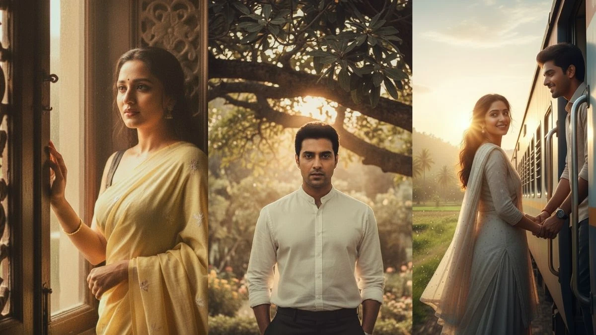 Generate a hyper-realistic scene recreating the iconic 90s train romance. The couple is standing at the door of a moving train, holding hands. The woman is looking back at the man with a soft smile. The background is a blurred, lush green rural Indian landscape. Use golden-hour sunlight, lens flare, and an 8K ultra-realistic cinematic filter to capture the movement and emotion. Keep the faces exactly the same as the uploaded photos for originality.