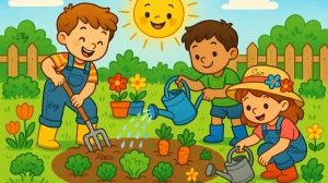 In this garden image, the hidden words Sky, Boy, Fence, Sun, and Flower are cleverly camouflaged within the elements of the scene. The word Sky is found hidden in the tree leaves near the fence. Boy is subtly integrated along the boy’s shirt and body.