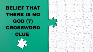 The clue asks for a single word (7 letters) meaning “belief that there is no God.” The answer, ATHEISM, fits exactly: