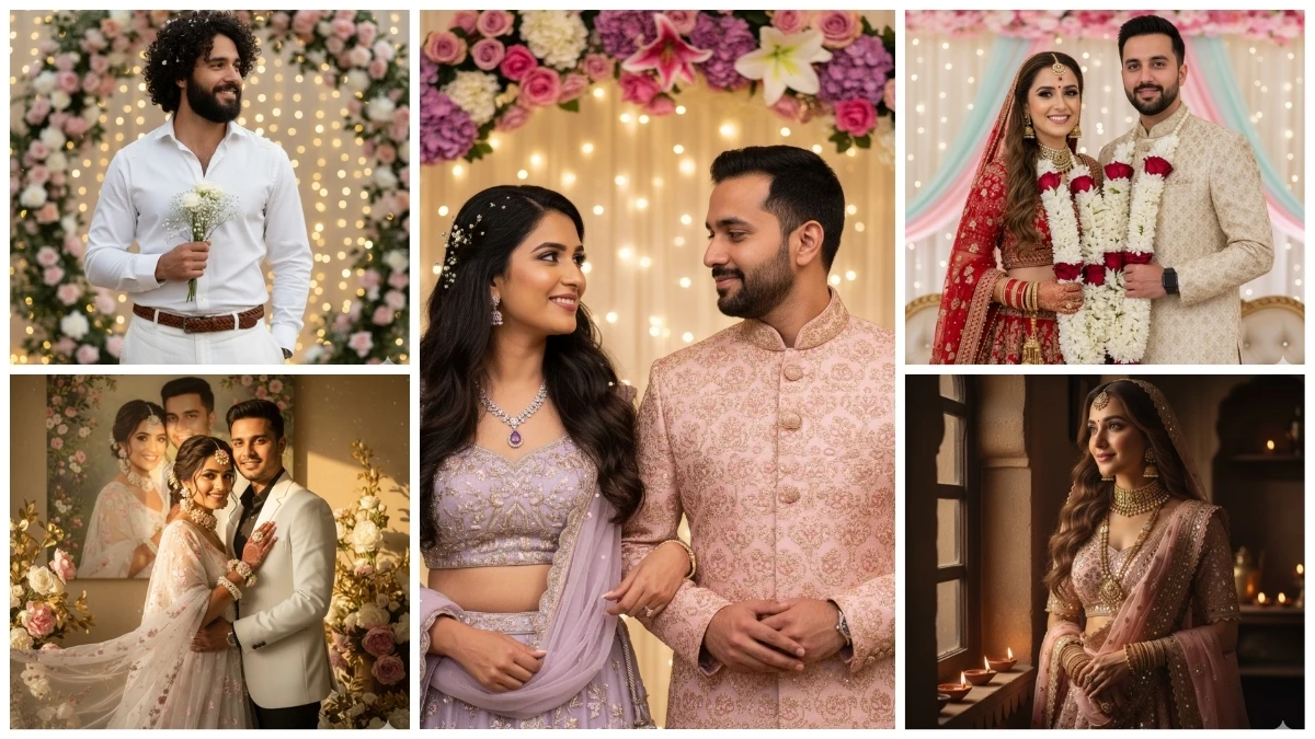 - Write a highly descriptive prompt: include the couple’s pose, attire, emotion, venue features, lighting, camera angle, and mood (example: “Bride and groom under floral arch at dusk, radiant smiling faces, soft gold light, shallow depth of field, cinematic 8K, lens flare, elegant wedding attire, preserve facial features”).