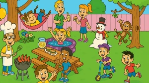 The hidden spoon in the image can be found near the boy playing with the hula hoop. It is tucked behind his leg, blending into the background and making it tricky to spot. The spoon is not immediately noticeable, adding to the challenge. The vibrant colors and busy scene draw attention away from the subtle placement.