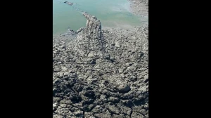 In this picture, the hidden animal is an crocodile camouflaged among the cracked mud near the water. Its body blends seamlessly with the surroundings, but on close observation, the head, tail, and body outline are visible just below the center leading to the water.