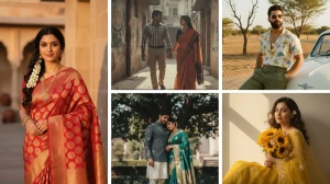 Mention clothing, poses, and props: Elements like “bell-bottom jeans, velvet dress, classic saree, guitar, vintage car” add depth and realism.