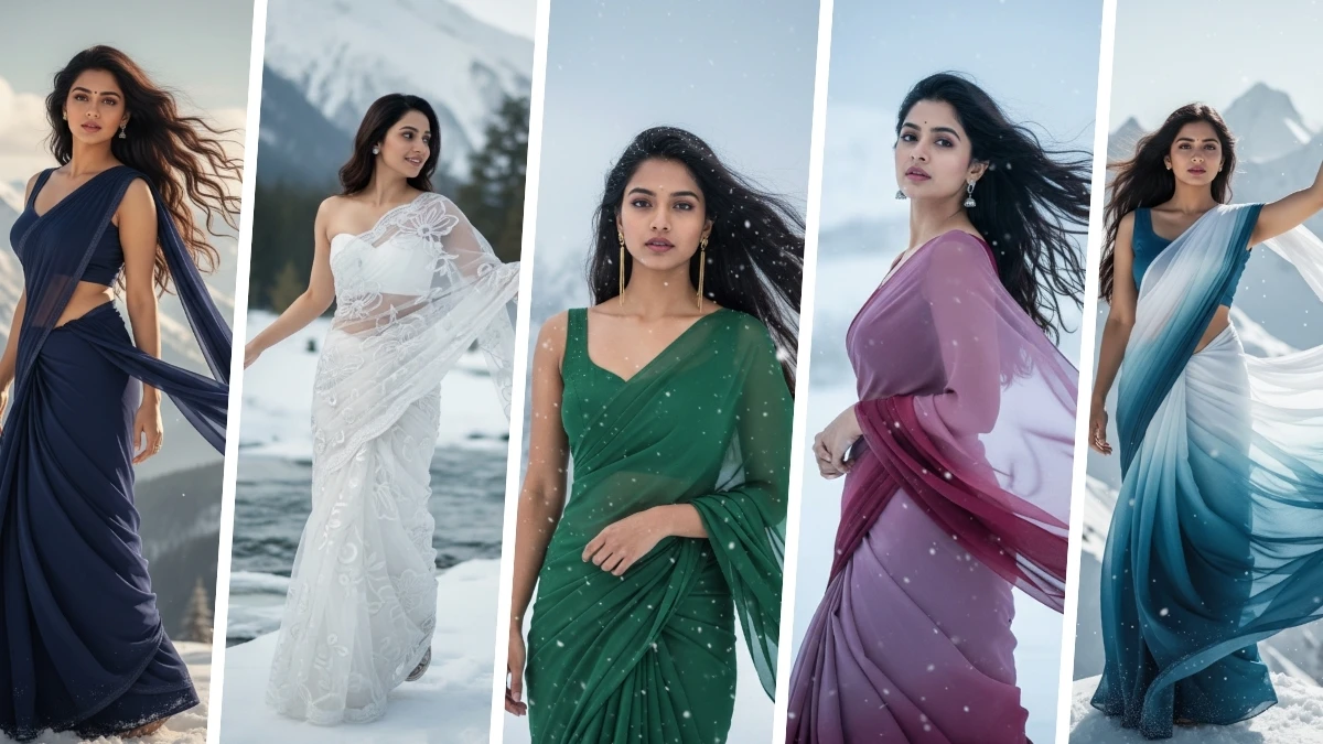 "Transform this image into an ultra-realistic 8K cinematic portrait of a young woman standing in snowy hills. She wears a soft plum-to-deep-wine ombre chiffon saree flowing in the cold breeze, paired with a deep-wine sleeveless blouse. Her long, flowy hair is lifted by the wind, and she wears small silver earrings. She strikes a sideways pose with a gentle turn, the pallu drifting behind her. The background features white snowy hills, soft falling snow, and cold cinematic lighting, creating a serene and dramatic atmosphere."