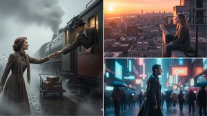Setting/Backdrop: Reference familiar cinema scenes (e.g. rainy city streets, desert wastelands, elegant ballrooms).