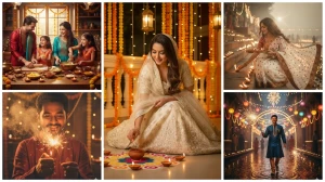 Gemini AI’s editing magic captures warm golden lighting, glowing diyas, colorful outfits, and the joyful spirit of togetherness, instantly elevating ordinary selfies into magazine-style festive portraits.