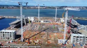 After exploring building in Walton Hall Park and suburban Kirkby, Everton picked the Bramley-Moore Dock along the River Mersey as its preferred site in 2017, and ground was broken in 2021. A dredger made 130 round trips into the Irish Sea to collect nearly 17 million cubic feet (480,000 cubic meters) of sand to fill in the dock area over three months.