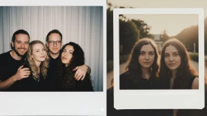 “Create a 4K HD realistic Polaroid-style photograph of the people in the provided images. They are posing together. Keep the faces unchanged, add slight blur and consistent lighting, with a white curtain backdrop, like a cozy candid film photo.”