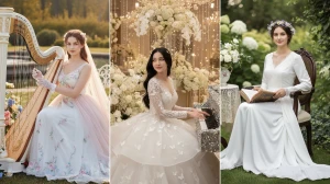 "A young woman, elegantly dressed, is seated outdoors next to a large, ornate white and gold harp. She is wearing a flowing white gown with delicate pink, blue, and green floral embroidery, and a light pink gown with a long, flowing veil that drapes behind her. Her hands are positioned on the harp strings, and she is wearing white lace gloves. She is looking directly at the camera with a serene expression. The setting is a beautiful garden with a white chair, a small table with a teacup, numerous pastel-colored floral arrangements, and in the blurred background, a fountain and a swan in a pond are visible. Don't change the face, make sure the face is the same."