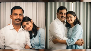 "A formal portrait of an Indian father and his teenage daughter. The father is on the right, with short dark hair and a mustache, wearing a teal button-up shirt and a white 'mundu' or dhoti. His right hand is resting gently on his daughter's shoulder. The daughter is on the left, with long dark hair, wearing a purple 'salwar kameez' with intricate white embroidery on the neckline, and a white floral-patterned 'dupatta' draped over her left shoulder. Both are looking directly at the camera with a neutral expression. There's a soft, dramatic shadow on the wall behind them from an unseen light source, giving a warm, slightly vintage feel to the image."