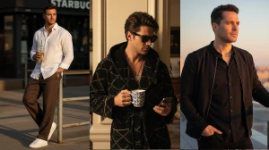 "A 28-year-old handsome man standing in front of Starbucks, dressed in a pastel white shirt and dark brown linen baggy pants, paired with white sneakers and a silver watch. He is holding a Starbucks cold drink in his right hand, with his left hand casually in his pocket, adopting a relaxed pose as he leans on the railing. The golden hour sunlight casts a warm glow, with cinematic lighting and a shallow depth of field creating a soft bokeh effect in the background. The image is ultra-realistic, with his face an identical match to the reference, capturing the essence of the moment perfectly."