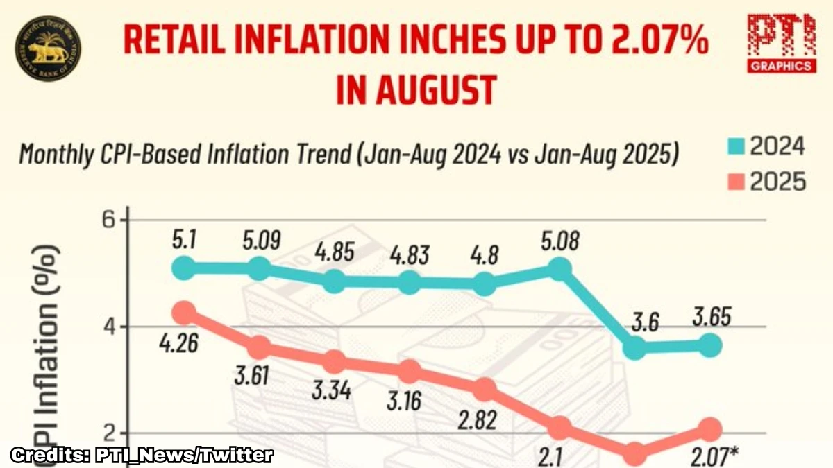 New Delhi, Sep 12 (PTI) Retail inflation inched up to 2.07 per cent in August from 1.61 per cent in the preceding month, driven by a rise in prices of kitchen items, like vegetables, meat, fish, and eggs, according to government data released on Friday.