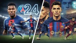 "Design a high-energy, cinematic football poster showing the subject with the identical face as the reference photo in the Paris Saint-Germain 2025 kit. Include a close-up portrait that captures fierce determination, matching the facial features 100%. Add a side profile view that captures a sprint, and a full-body shot in the PSG 2026 national kit, always keeping the exact face from the reference. Show the subject mid-goal celebration at high speed. The background should feature the PSG logo and number 24, both glowing above a stadium crowd, with number 24 and ‘AV’ boldly on the jersey, shorts, and socks, using the subject’s face throughout."