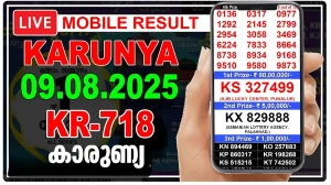 The most awaited Kerala Lottery Karunya KR-718 result for today 09.08.25, Out shortly. The draw usually takes place at 3 PM in Thiruvananthapuram. Players who have participated in today’s Kerala Karunya KR-718 lottery can check the results here. The player who secures first place will receive a prize amount of Rs 1 crore.