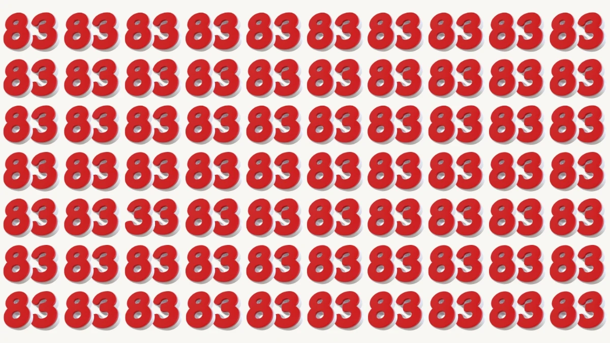 In this observation-based optical illusion, the entire grid is filled with repetitions of the number 83, and your challenge is to quickly pick out the odd one that actually reads 33 instead. At first glance, the uniform red color, 3D style, and identical spacing trick your brain into assuming that every pair of digits is the same, causing you to skim over the subtle change in the first digit.