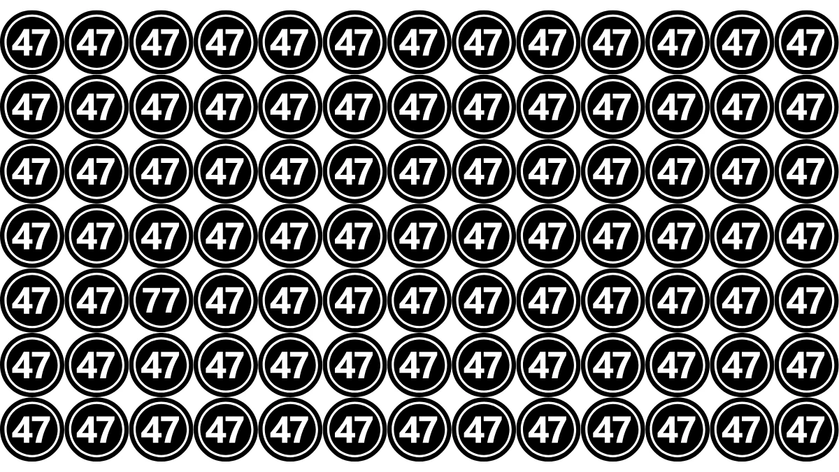 In this observation puzzle, the image is filled with identical black circles containing the number 47, and the challenge is to spot the single circle that shows the number 77 within just 7 seconds. On careful inspection, the odd number appears in the third row from the bottom and the third circle from the left, where both digits are 7 instead of 4 and 7.