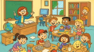 The word ‘Globe’ is near the modeling clay in front of the seated children, and ‘Students’ is written along the back of the chair on the right side of the image.