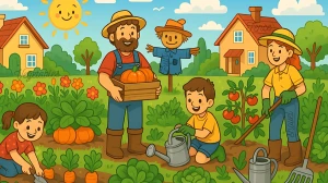 The word "Sun" is cleverly tucked into the scarecrow's shirt. You’ll find "Axe" disguised in the greenery near the boy with the watering can.