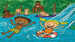 "PADDLE" can be spotted on the girl’s float in the bottom right, and "WATER" is cleverly written along the slide on the right.