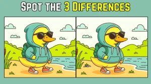 In the image, we see a cute yellow duck wearing sunglasses and a jacket while taking a stroll near a tranquil pond. The two images side by side appear very similar at first glance, but on closer inspection, you’ll notice that there are three distinct differences.