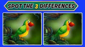 This optical illusion challenge invites viewers to spot three subtle differences between two seemingly identical images of a colorful parrot perched in a vibrant jungle setting.