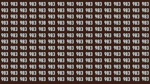 The image presents an optical illusion challenge, where the goal is to spot the number "938" amidst numerous "983" figures. If you focus carefully, you'll notice that the "938" stands out because the "9" is the same, but the second digit is a "3" instead of an "8." To solve this challenge, carefully scan the image and pay attention to any number sequence that deviates from the common "983."