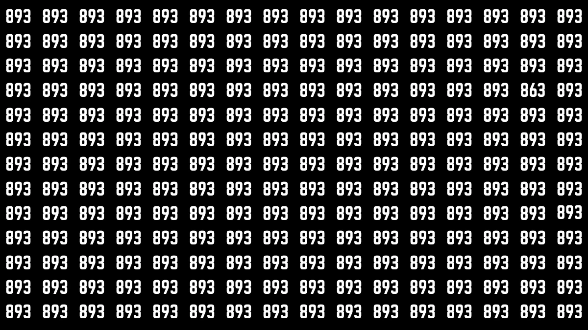 In this optical illusion challenge, the goal is to spot the number "863" hidden amongst a sea of "893" in the image. At first glance, the numbers may all appear identical, making it seem impossible to find the outlier. However, those with sharp eyes and attention to detail will be able to detect that the number "863" is nestled in the fourth row from the top, in the second column from the right.