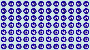 In this optical illusion challenge, the goal is to spot the numbers "34" and "42" hidden among a sea of "43" within 7 seconds. The background is a grid filled with the number 43 in blue hexagonal shapes.