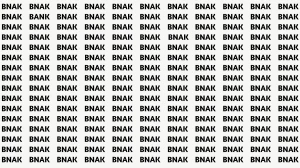 In this optical illusion, the word "BANK" is hidden among many instances of "BNAK." If you focus carefully, you will find that the word "BANK" appears in the second row and the second column, clearly marked by the correct letter sequence.