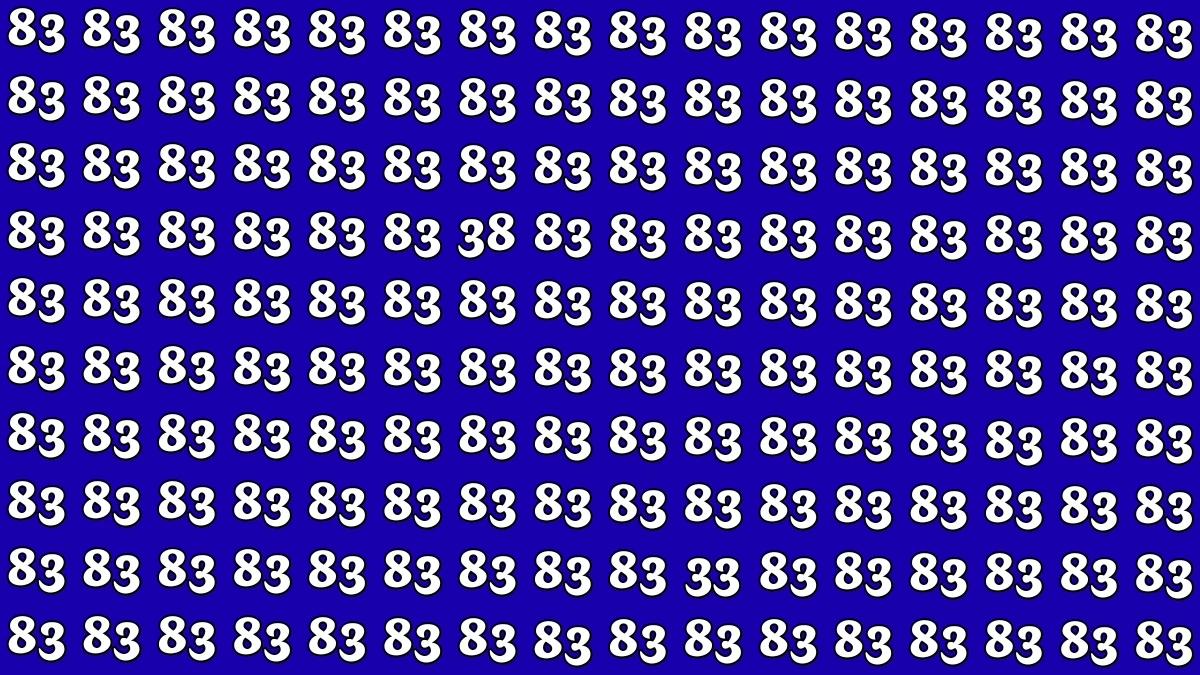 This optical illusion challenges your observation skills to spot the numbers "33" and "38" hidden among the repeated "83"s. At first glance, the array of "83"s might make it hard to locate these two numbers, but with focus, you'll see that both numbers are strategically placed. The number "38" can be found towards the top-right of the image, surrounded by the usual "83"s, while the number "33" is positioned towards the bottom-left. The contrasting shapes and orientations of these numbers among the repetitive "83"s create a visual distraction that makes them harder to spot. It's a great exercise for your eyes, improving your focus and sharpness in spotting subtle differences in patterns.Optical illusions like this one are designed to enhance cognitive function by forcing the brain to adjust to visual stimuli and hone in on specific details.