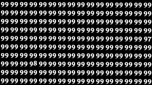 In this optical illusion, the image is filled with the number 99 repeated across rows and columns, making it difficult to spot any differences at first glance. However, hidden among them are the numbers 97 and 98.
