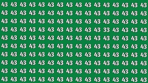 This optical illusion challenges your ability to quickly and accurately identify subtle differences in a sea of similar numbers. The image is filled with repetitions of the number "43" arranged in a tight grid against a green background. The goal is to spot the one instance of "33" hidden among all the "43"s within 6 seconds. This task tests your focus, pattern recognition, and visual scanning speed. The numbers are designed in the same font and color to make the "33" blend in almost perfectly, which tricks the brain into glossing over it unless you're paying very close attention. Exercises like this are not just fun but also stimulate the brain and improve concentration and observation skills.