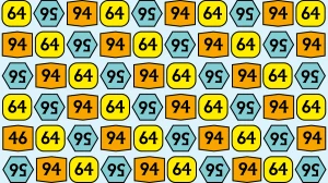 At first glance, the image may appear to be a jumble of colorful shapes filled with numbers. Each shape contains either 64, 94, or a cleverly flipped 56 that looks eerily similar to the target number.