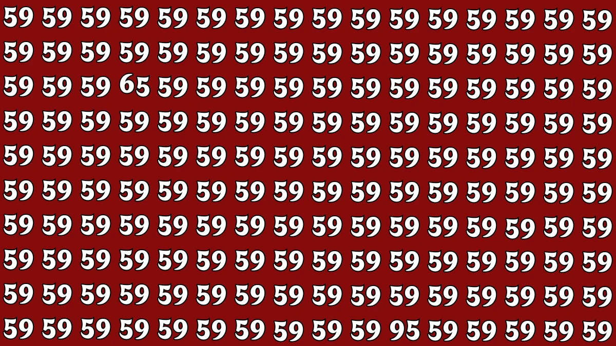 In this optical illusion, you're tasked with spotting the numbers 65 and 95 hidden among a series of 59s. At first glance, the image may seem like a chaotic jumble of digits, but with a little focus and quick observation, you'll realize that the numbers 65 and 95 are cleverly camouflaged within the repetitive 59s.