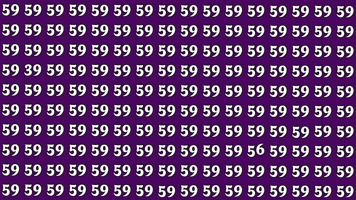 In the optical illusion, the numbers "56" and "39" are hidden among a series of "59s." The number "39" is located in the fourth row from the top, and it's the third number from the left, standing out due to its difference from the repeating "59" pattern. The number "56" is found in the eighth row from the top, located in the fifth column from the right. The design of the image cleverly places these numbers amidst the repeating "59s," making it harder to spot them quickly.