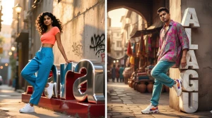 "Design an ultra-realistic digital portrait of a person in a full-body dynamic pose, dressed in casual, vibrant clothing (shirt, pants, shoes) with a modern and laid-back style. Display the word 'ALAGU' vertically in large 3D glossy letters, in a contrasting color, making the text look like a real, solid object. Have the model interact with the text, such as by leaning against it or sitting on it, for a more immersive and lifelike composition."