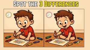 Lastly, one of the crayons near the boy has a different color in each image; on the left, it's purple, and on the right, it's yellow. These are the three differences to spot in this fun and challenging puzzle!