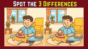 In this "Spot the Difference" challenge, three subtle differences can be found between the two images. First, the window in the left image shows a cloud to the right of the boy’s head, but in the right image, this cloud is missing. Second, the plant placed on the table in the left image has a larger leaf on the lower right side, which is not present in the right image. Lastly, the iron’s base leg in the left image is visible, but in the right image, the base leg is missing. These small yet distinct changes are designed to test your observation skills. Though each difference is subtle, with a keen eye, they can be spotted quickly. This fun puzzle encourages attention to detail, and while the differences may seem minor at first glance, they make the challenge a bit trickier and more rewarding when solved.