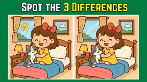 In this "Spot the Difference" challenge, you're asked to identify three subtle differences between two similar images of a girl peacefully sleeping next to her cat. The task encourages you to focus on minute details, often requiring a keen eye for small changes.