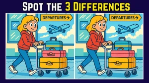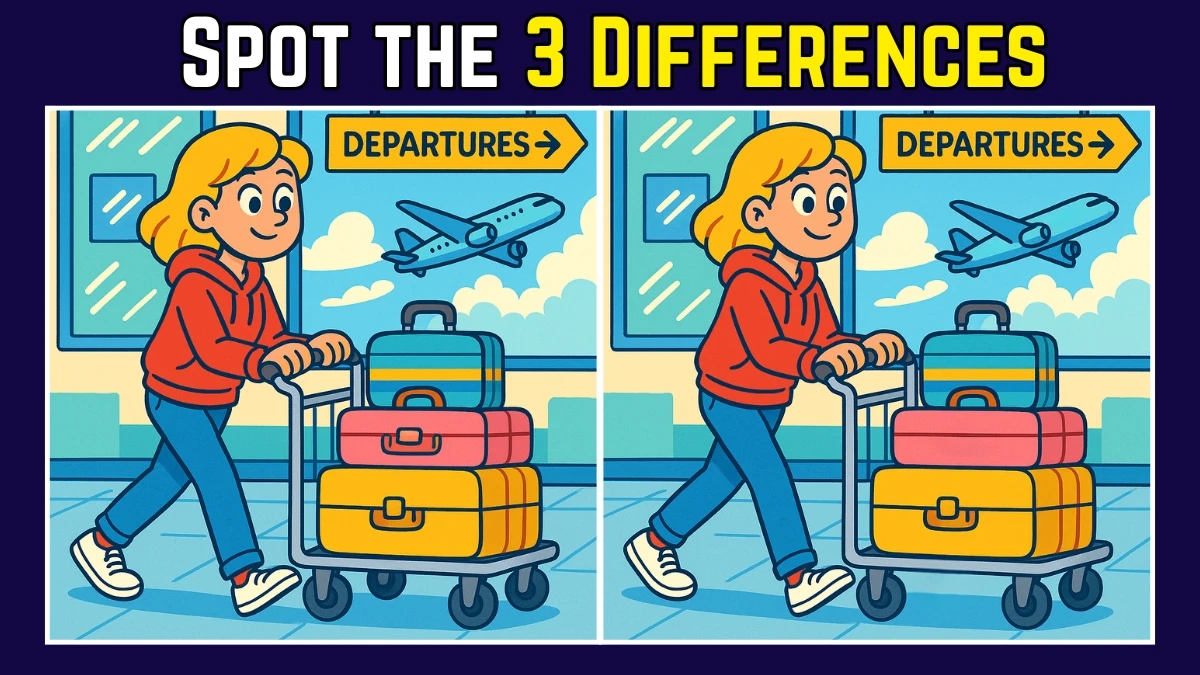 In this "Spot the Difference" puzzle, three distinct changes can be observed between the two images. First, the Pink suitcase has a lock on the left image, but it is missing in the right one. Second, the airplane flying in the background on the left has a window, whereas the right image shows the plane without any window. Lastly, the trolley’s wheel on the left is fully round, while on the right image, the wheel is missing part of its shape. These differences are subtle yet require careful attention to details. The suitcase lock, airplane window, and trolley wheel may initially seem minor, but they provide a challenge for those attempting to spot them within the given time. Despite being small changes, they make the puzzle fun and engaging for those who enjoy challenges in visual observation. Keep looking carefully, and the differences will soon become apparent!