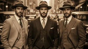 Create a sepia-toned photo based on the uploaded image. Three stylish men in their 20s or 30s stand on a 1920s or 1930s city street, each wearing a classic fedora and a three-piece suit with ties. One wears a light, textured suit; another, a dark pinstriped suit; the third, a medium-toned suit. They have their hands in their pockets and gaze confidently at the camera, with vintage cars blurred in the background. Convey a dapper, Prohibition era or early Hollywood mood. Keep the facial features exactly as in the reference, with no changes.